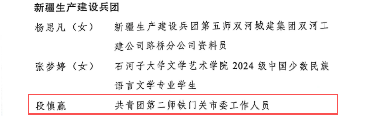 其中,第二师铁门关市西部计划志愿者段慎赢同志荣获2025年全国优秀共青团员荣誉称号。