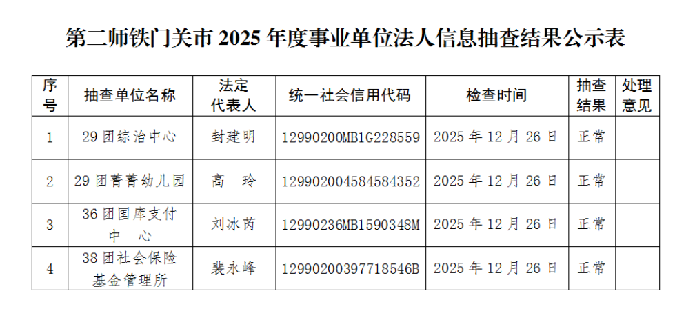 根据《事业单位登记管理暂行条例》及其实施细则、《事业单位法人年度报告公示办法》和《事业单位法人公示信息抽查办法》文件规定,为进一步加强师市事业单位法人事中事后监管,保证事业单位法人公示信息的及时性和准确性,我局于2025年12月26日开展2025年度事业单位法人公示信息“双随机、一公开”抽查工作,对29团综治中心、29团幼儿园、36团国库支付中心、38团社会保险基金管理所4家事业单位公示信息进行抽查。现将抽查结果予以公布。