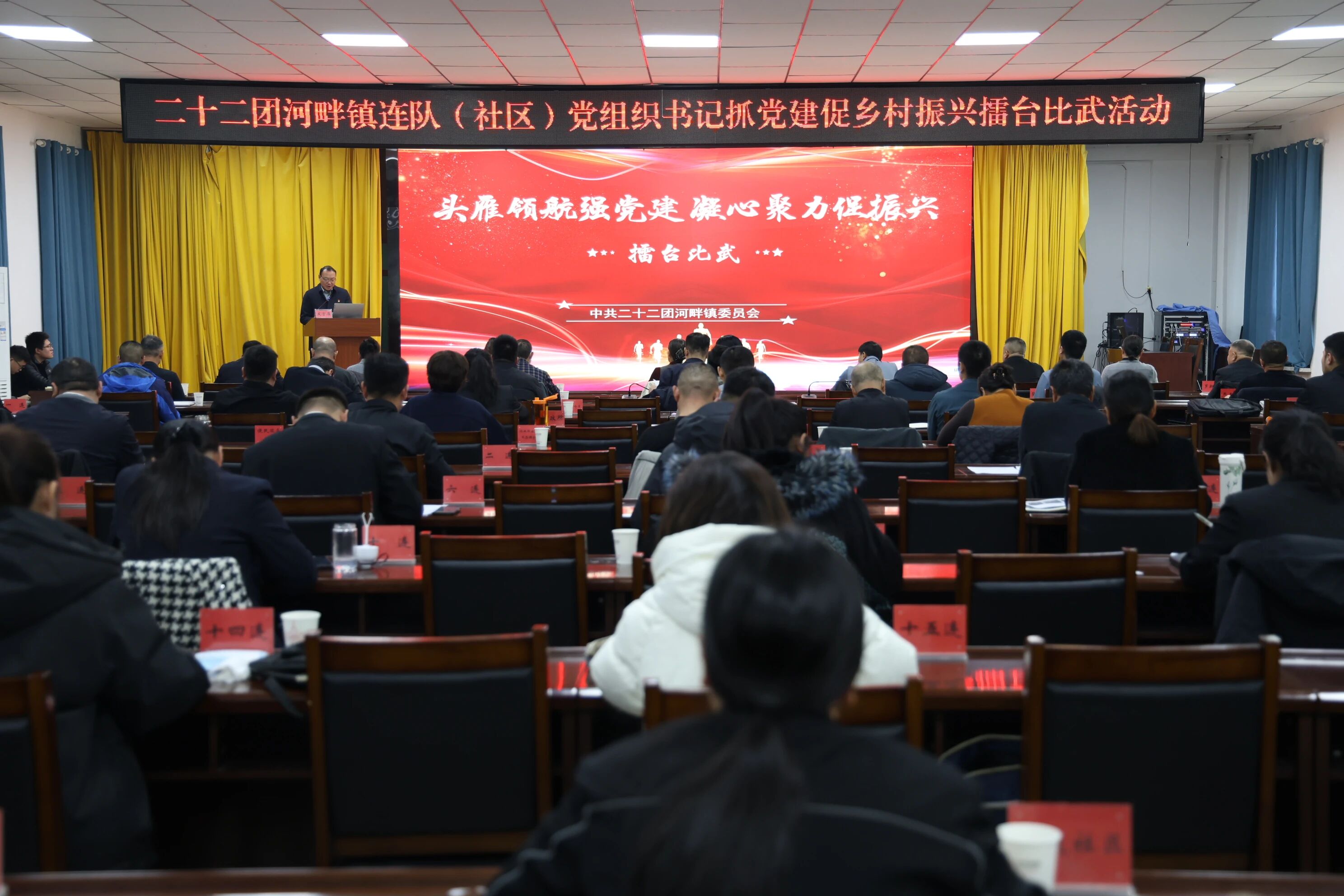 为深入学习贯彻党的二十届四中全会精神,扎实推进新时代党的建设新的伟大工程,以党建引领“十五五”时期团镇高质量发展,近日,二十二团河畔镇举办连队(社区)党组织书记抓党建促乡村振兴“擂台比武”活动。活动以“头雁领航强党建 凝心聚力促振兴”为主题,通过“PPT展示+视频展播+现场演说”的形式,集中检阅基层党建硬核成效,激励党组织书记在互学互鉴、比学赶超中锤炼本领、担当作为。团镇党委班子成员、机关事业单位负责人、各连队(社区)党组织书记及党员群众代表、劳动模范、特邀评委等参加活动。