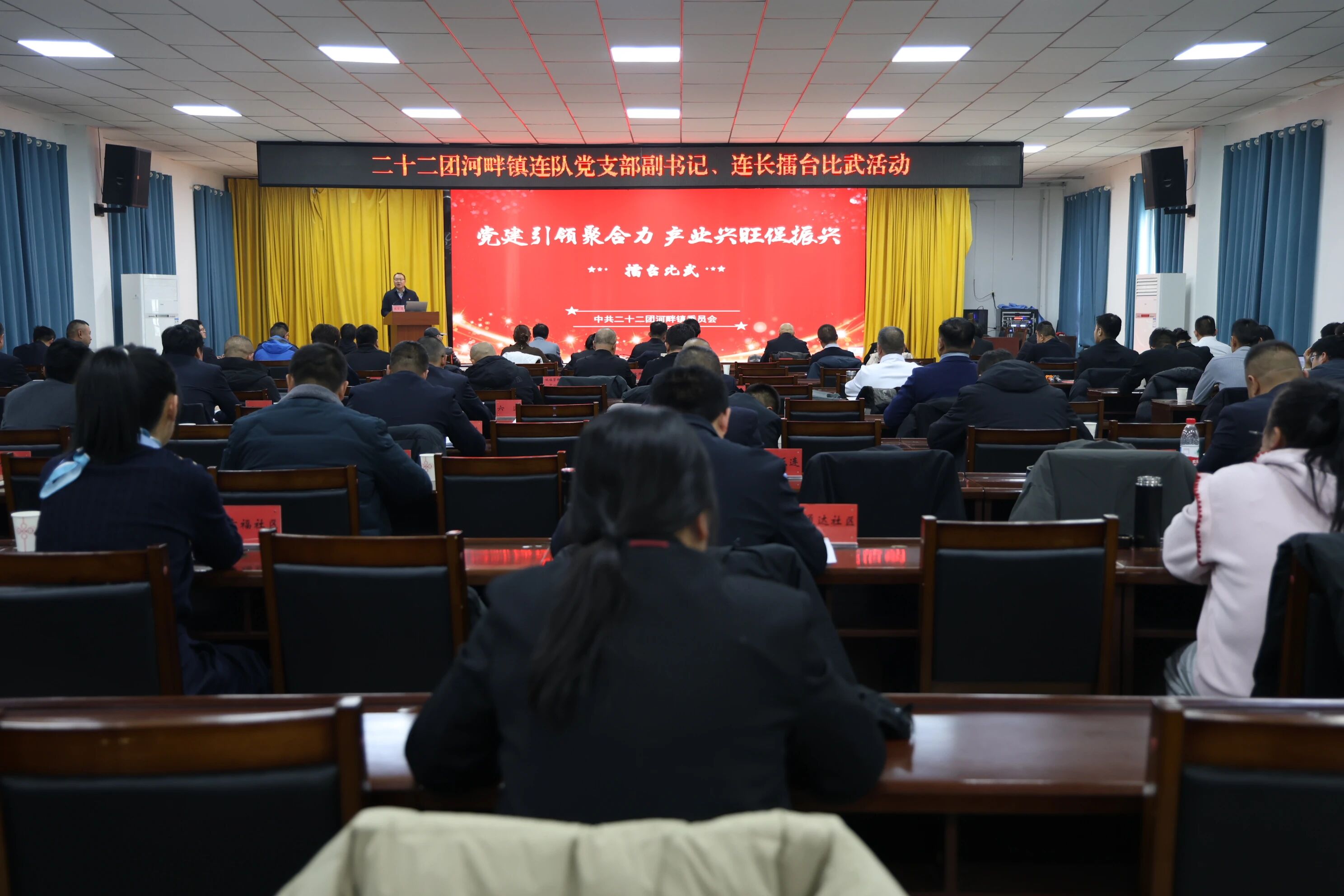 为深入贯彻落实党的二十届四中全会关于全面推进乡村振兴的决策部署,以高质量党建引领连队产业高质量发展,近日,二十二团河畔镇举办连队党支部副书记、连长“擂台比武”活动。活动以“党建引领聚合力 产业兴旺促振兴”为主题,聚焦产业振兴与连队经济发展,组织16个连队的连长同台竞技,比拼产业发展的“实功”“实绩”,为“十五五”开好局凝聚强大合力。团镇领导班子成员、相关单位负责人及基层代表参加活动。