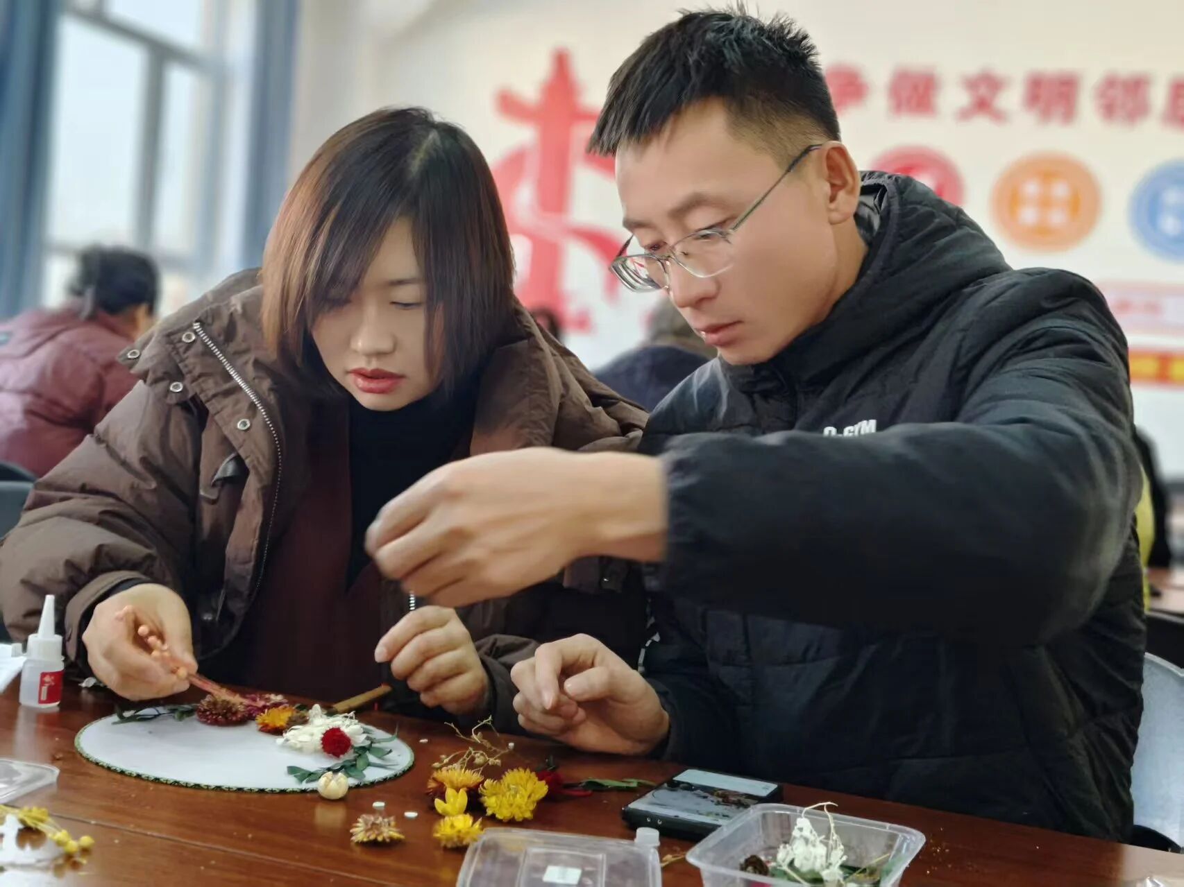 活动现场,志愿者们提前摆好了空白的团扇、鲜艳的永生花和各类经典书籍。大家围桌而坐,先跟着手工老师学习制作技巧——如何将永生花固定在扇面上,怎样构思布局才更雅致。一簇簇花朵在扇面间渐渐铺展开来,化作一幅幅生动的图案。“平时难得静下心来陪爱人做手工,今天和邻居们一起动手,感觉特别温暖。这把扇子以后就放在家里,既是装饰,也是一段美好的回忆。”刚完成作品的赵女士手持团扇,笑意盈盈。传统的团扇工艺,也因这份共同创作的暖意,添了几分浪漫与雅致。
