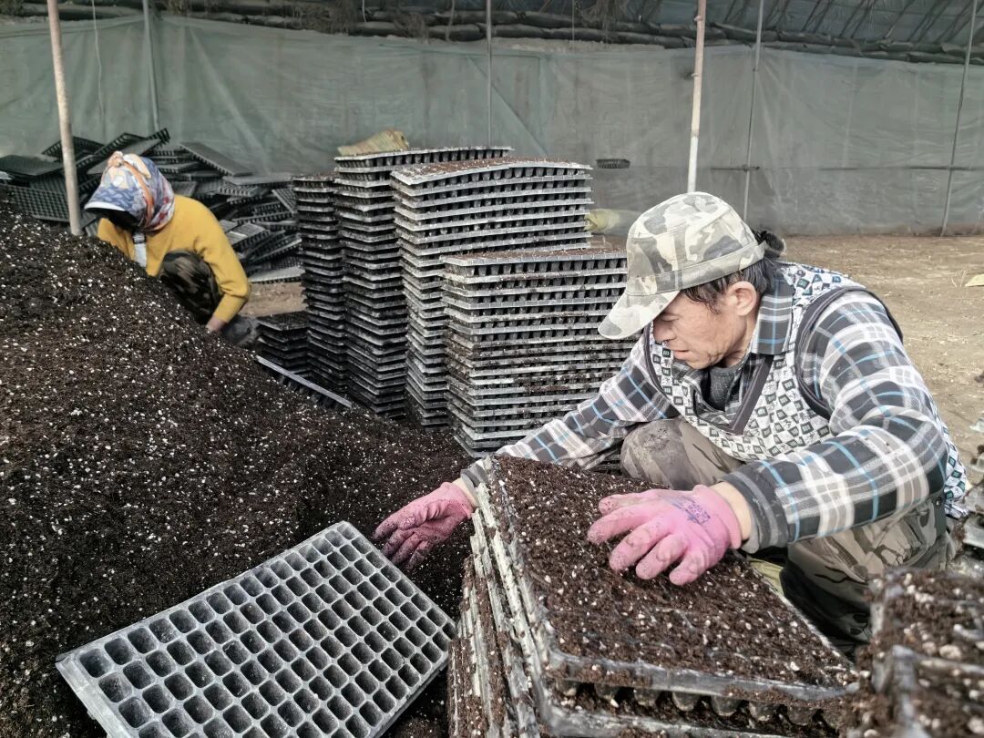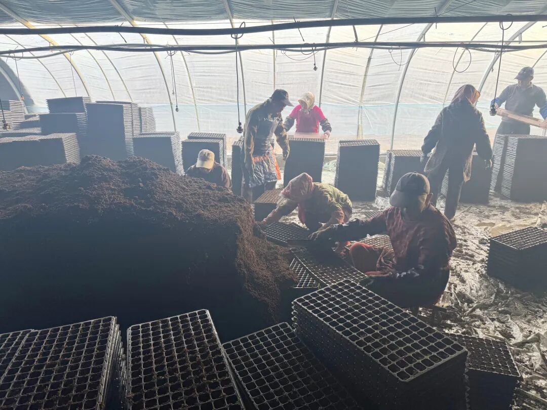 眼下正值春耕备耕关键期,二十二团九连的育苗大棚内一片热火朝天的繁忙景象。农户们抢抓农时、分工协作,有条不紊地往育苗盘里装填营养土,再将装好土的育苗盘整齐码放,为后续点籽、出苗工作筑牢坚实基础。值得一提的是,大棚里还活跃着不少共建村村民的身影,他们与连队职工并肩劳作,成为兵地共建热潮中一道亮眼的风景。