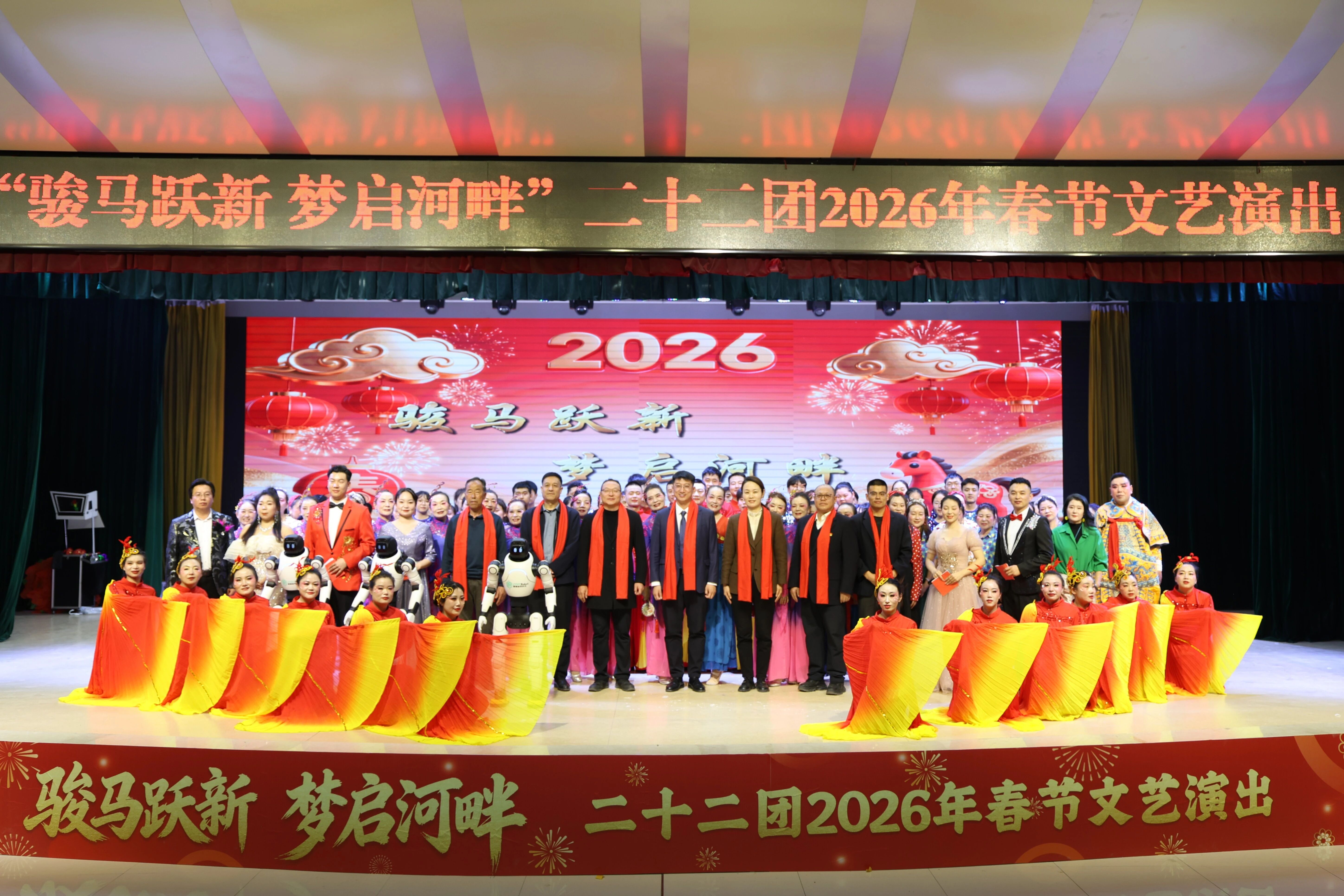 骏马驰春迎佳节,欢歌笑语庆团圆。近日,二十二团2026年“骏马跃新 梦启河畔”春节文艺晚会在团文化中心精彩上演。晚会汇聚歌舞、戏曲、杂技、小品、魔术、机器人表演等多种艺术形式,艺韵河畔演出队、幼儿园、西部计划志愿者、金川热电等团镇各界参演主体同台献艺,为职工群众献上了一场充满年味、洋溢温情、彰显时代风貌的文化盛宴。