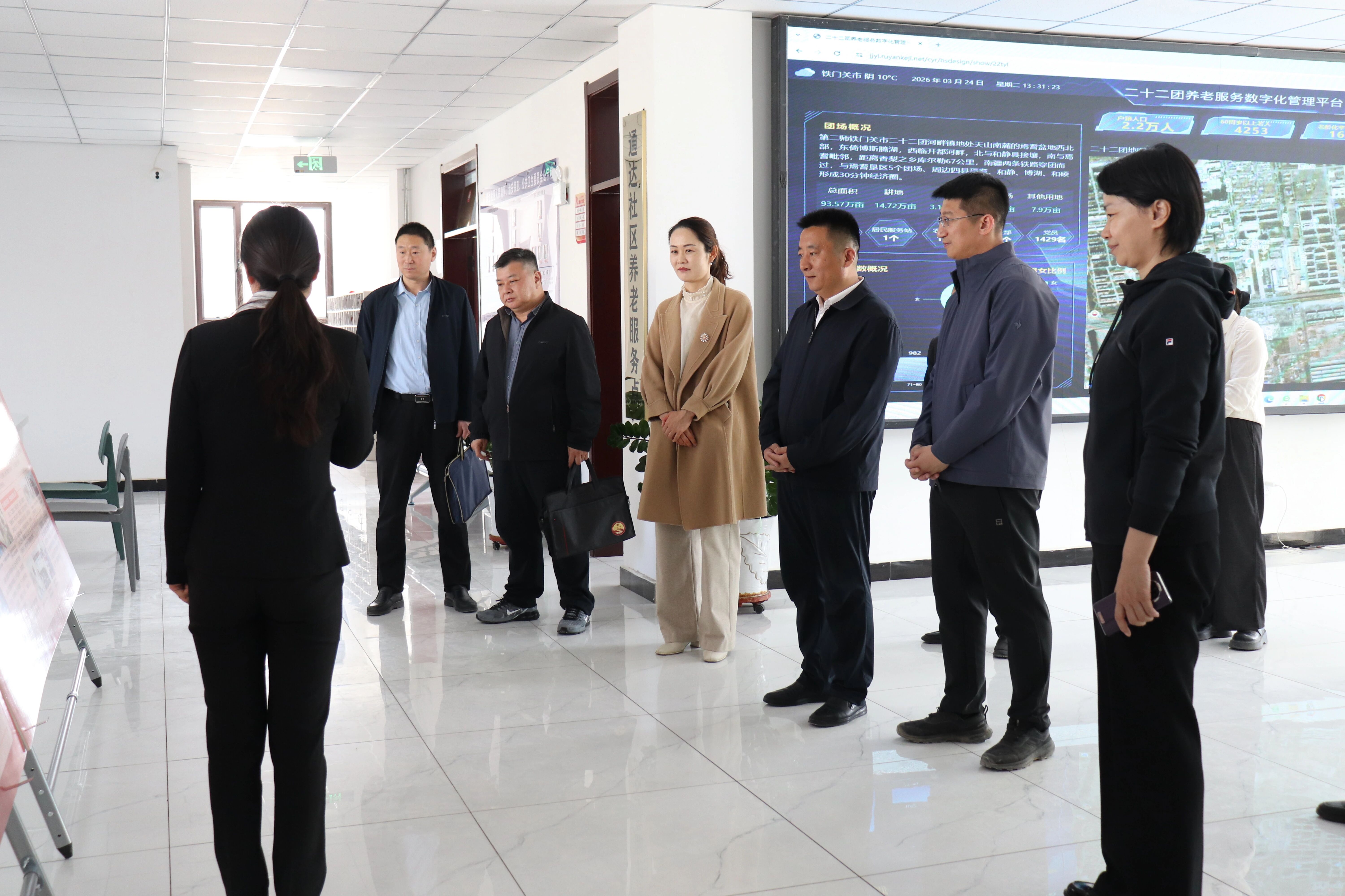 近日,兵团民政局党组成员、副局长田固,兵团民政局机关党委副书记、机关纪委书记、老龄工作(养老服务)处负责人陈广玉一行,赴第二师二十二团调研养老服务体系建设工作。第二师副师长、铁门关市人民政府党组成员、副市长叶海英,第二师铁门关市民政局党组成员、副局长马公惠陪同调研。二十二团主要领导参加调研。