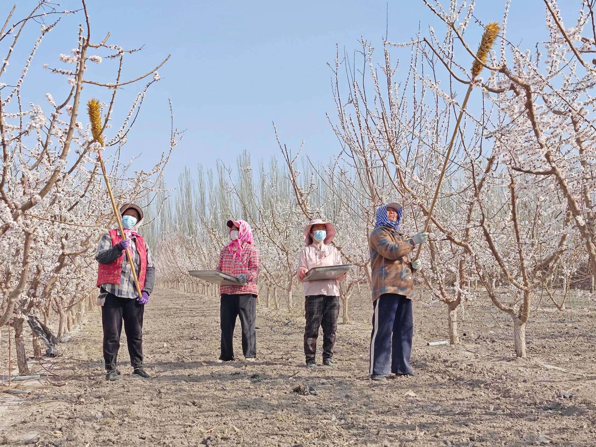 为保障吊干杏坐果率、提升果品品质,种植户正抢抓晴好天气,手持长杆授粉器,穿梭在果树间,小心翼翼地将花粉均匀涂抹在每一朵花蕊上,同时成群的蜜蜂在枝头飞舞采蜜、自然授粉,“人工+蜜蜂”双管齐下的授粉模式,为林果丰产丰收筑牢根基。