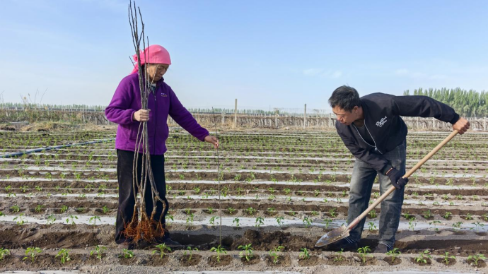 近年来,葡萄市场行情持续低迷的困境,二十四团二连的葡萄种植户们主动求变。在连队党支部的带领下,他们走出团场取经,于今年果断开启“改园转型”之路——将葡萄园改为“乐淇苹果套种辣椒”模式,目前首批试点果园已进入苗木移栽阶段。