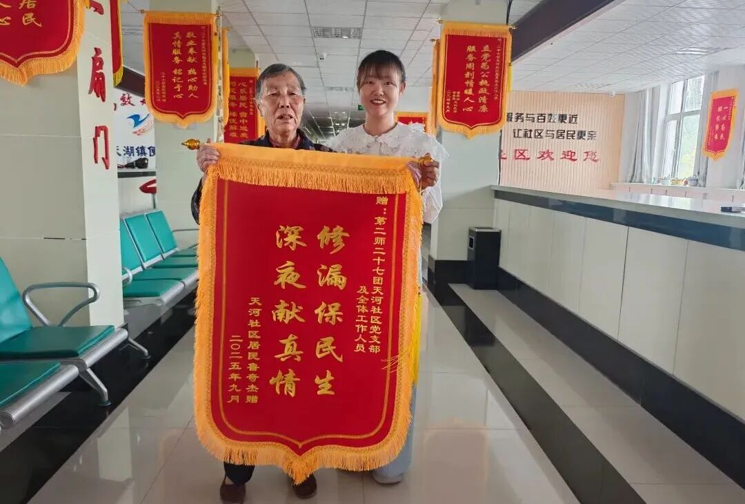 9月17日,天湖佳苑小区居民陈秀清将一面写有“修漏保民生 深夜献真情”的锦旗送到了天河社区,真心表达对社区党支部服务居民的一份谢意。