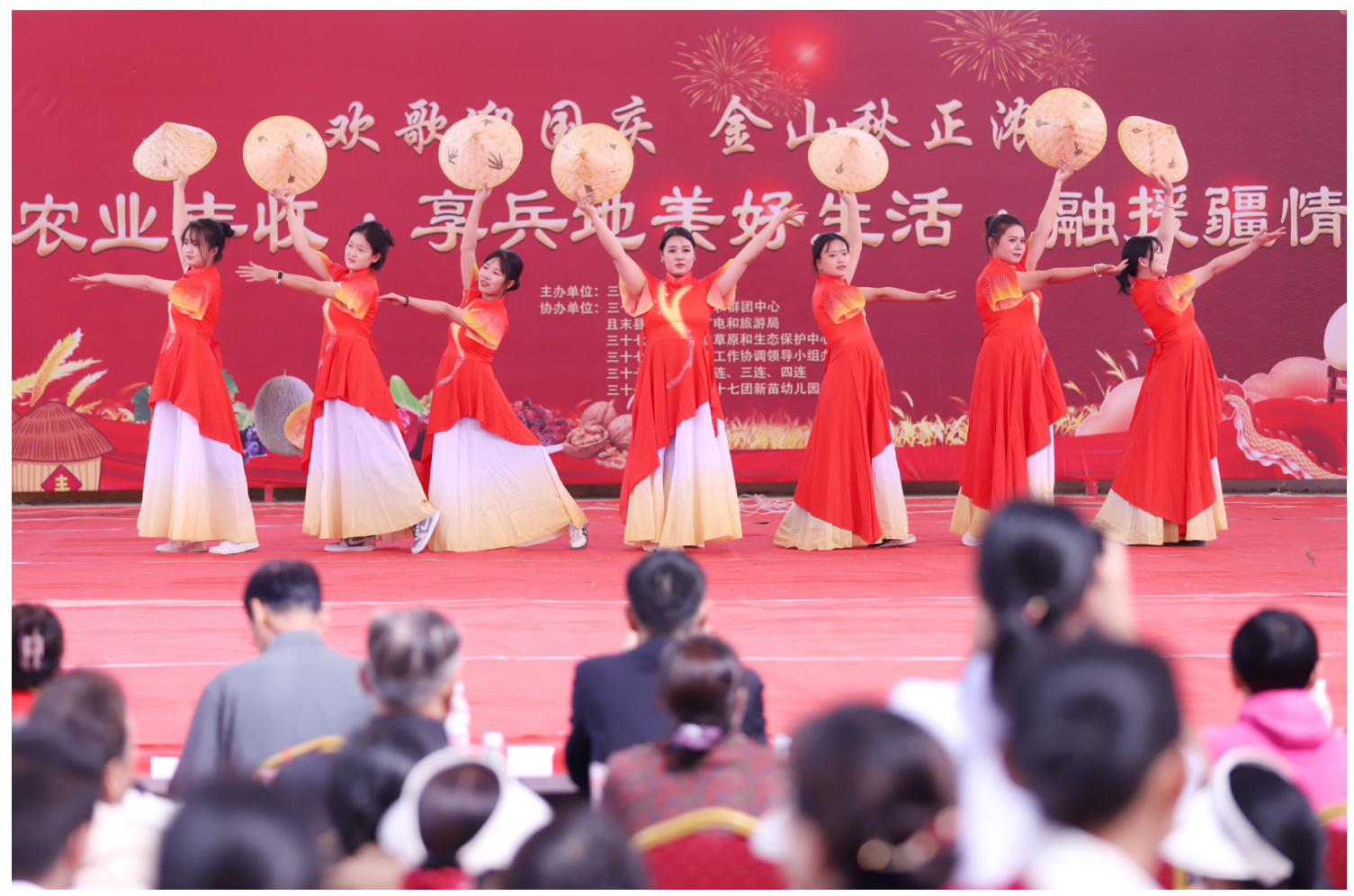 文艺演出在集体舞《欢庆》中拉开帷幕,欢快的节奏迅速点燃现场气氛。随后,歌唱《幸福中国一起走》、舞蹈《悯农》、情景剧《F4舰队》等12个节目轮番上阵,精彩的表演赢得台下千余名观众的阵阵掌声。中间穿插设置有奖问答环节,将现场气氛推向高潮,观众踊跃参与,现场气氛热烈。歌声、笑声、欢呼声汇聚成一片热闹的海洋。双方以铸牢中华民族共同体意识为主线,共同展示兵地农耕文化的厚重底蕴和丰收的喜悦之情。
