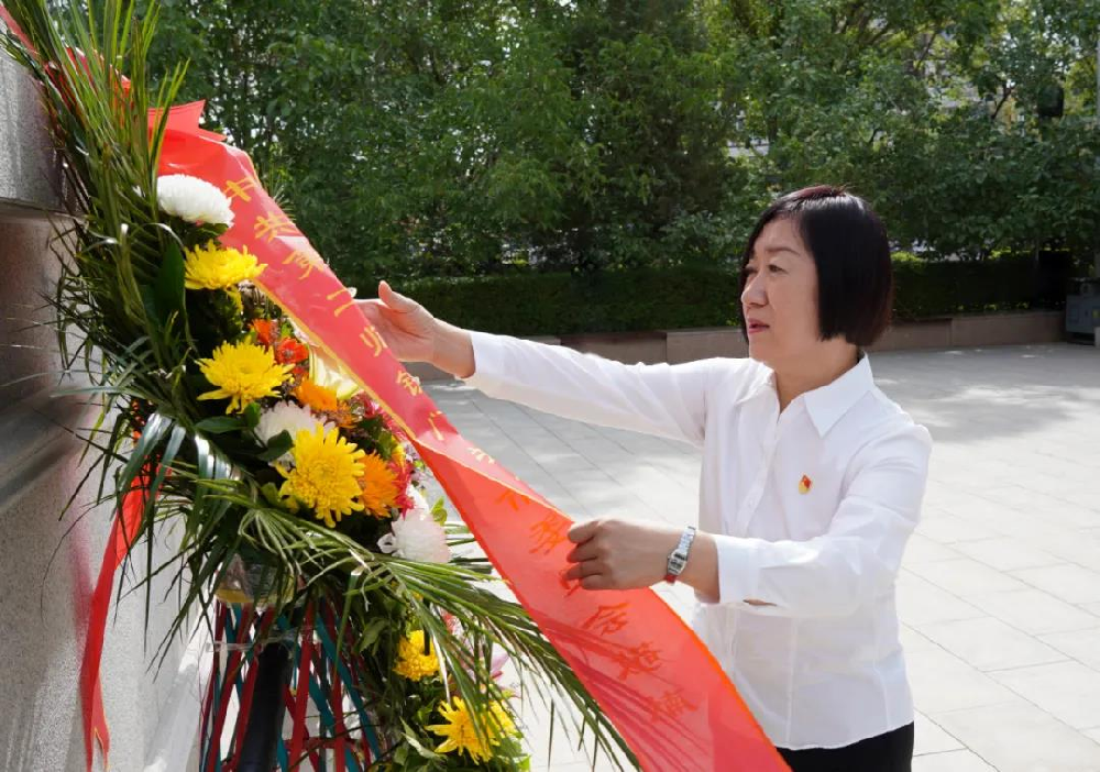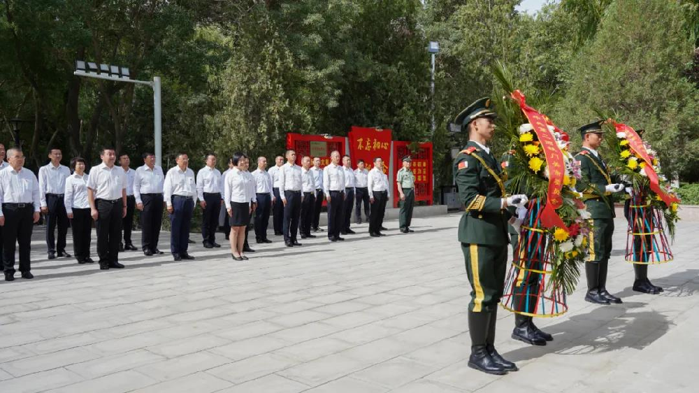 礼兵分别护送花篮,正步走向十八团渠纪念碑,将花篮一一摆放在纪念碑基座前。吴彬庄重地来到花篮前,认真整理花篮缎带,表达怀念追思之情。随后,参加仪式的全体人员依次瞻仰十八团渠纪念碑。
