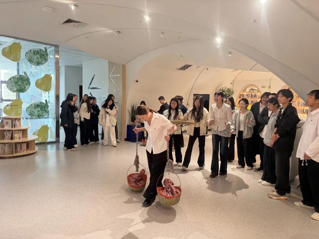 为了让红色体验更具代入感,活动特别设置了挑扁担体验环节。学生纷纷拿起扁担,挑起装满沙土的筐子,体验先辈们当年运土修渠的艰辛。