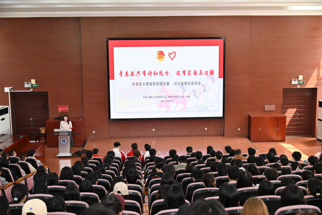 为深入贯彻落实习近平总书记给谢依特小学戍边支教西部计划志愿者服务队全体队员重要回信精神,引导广大高校毕业生扎根西部、奉献基层、勇担使命。4月20日至24日,第二师铁门关市西部计划宣讲团跨越千里奔赴河北,走进河北经贸大学、河北师范大学、河北传媒学院、保定学院,开展西部计划专题宣讲活动,面向内地青年学子发出诚挚邀约,号召广大青年奔赴边疆、建功西部,在广阔天地绽放青春光彩。