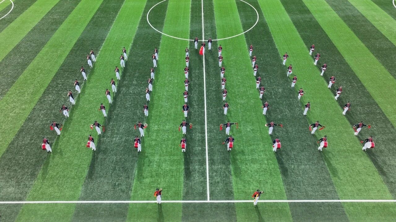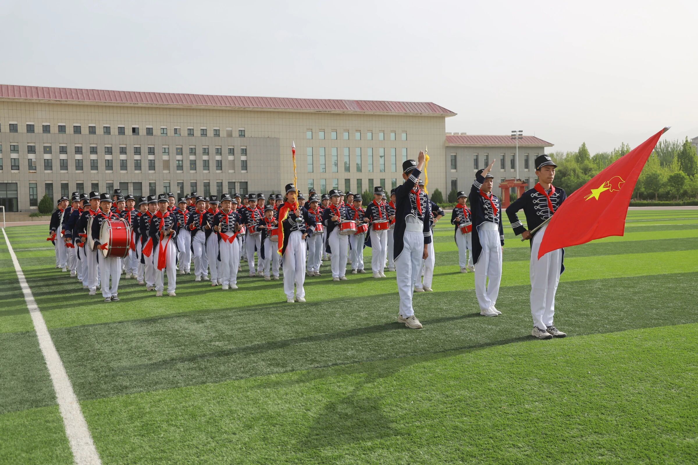 评审现场,孔雀中学少先队鼓号队精神饱满,整装待发。队员们身着统一规范的队服,佩戴鲜艳的红领巾,在天山脚下的校园里,以铿锵鼓点、嘹亮号声连贯演奏了《出旗曲》《退旗曲》《进行曲》《少年先锋队队歌》等规定曲目。队形整齐划一,变换流畅有序,步伐坚定有力,姿态昂扬自信,充分展现了二师铁门关市少先队员朝气蓬勃、团结向上、爱党爱国爱疆的精神风貌,彰显了兵团少先队的纪律性与凝聚力。
