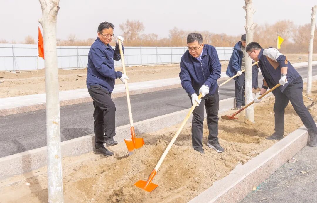 植树现场一片火热,师市领导与200余名机关干部来到建设大街,在专业技术人员指导下,明确分工、干劲十足。大家挥锹培土、平整踩实,每个环节都一丝不苟,每道工序都认真细致,以实干践行生态文明理念,用双手种下绿色希望。经过一番辛勤劳作,一棵棵新栽植的银白杨错落有致、迎风挺立,为春日的铁门关市增添了勃勃生机。
